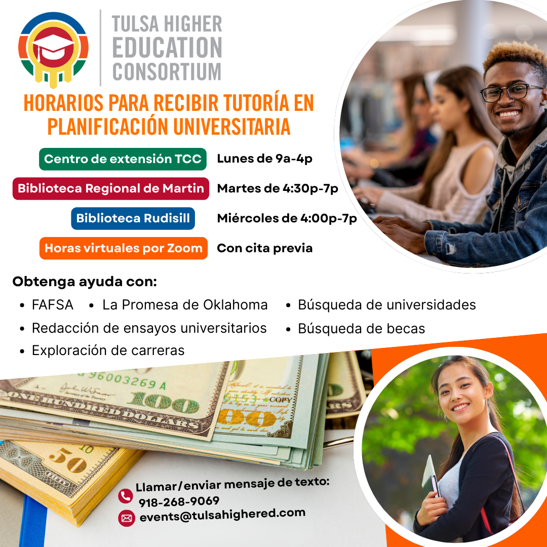 Monthly College & Financial Aid Office Hours In partnership with the Tulsa Community College Education Outreach Center Need help with your FAFSA or college applications? Join us for expert guidance during our monthly drop-in sessions. When: Every first Monday of the month Time: 4:30 PM – 7:00 PM Where: TCC Education Outreach Center (2201 S. Garnett Rd., Tulsa, OK) Support: Walk-ins are welcome. Bilingual Spanish support is available on-site. What We Can Help With: Completing the FAFSA (Free Application for Federal Student Aid) Navigating financial aid requirements General college application questions Questions? Please reach out to us at [email protected].